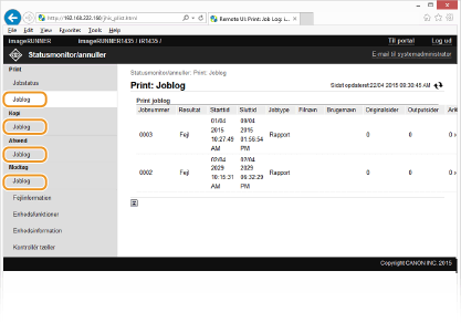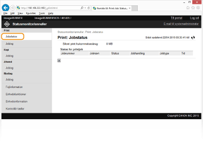 Når du logger på i systemadministratorstatus, vises alle de printdokumenter, der behandles i øjeblikket.