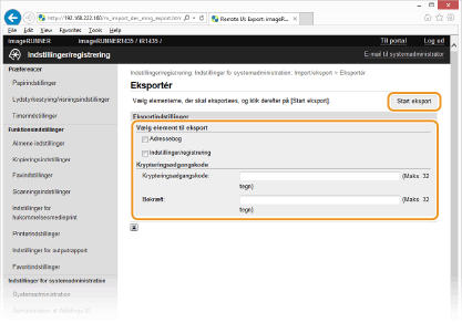 Angiv op til 32 alfanumeriske tegn for krypteringspasswordet. Angiv den samme adgangskode i tekstfeltet [Bekræft:] for at bekræfte den. Dette password er påkrævet, når du importerer dataene til maskinen.