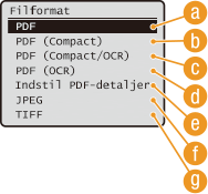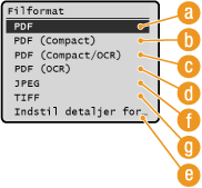 Du kan vælge mellem seks filformater, som dokumenterne kan konverteres til: <PDF>, <PDF (Compact)>, <PDF (Compact/OCR)>, <PDF (OCR)>, <JPEG> og <TIFF>. De scannede dokumenter konverteres til det filformat, der er angivet og sendes derefter til den angivne destination.