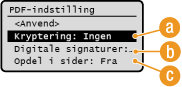 * Nogle elementer er kun tilgængelige, når tilbehøret Send PDF Security Feature Set (Udvidede funktioner til Universal Send) er aktiveret.