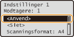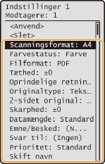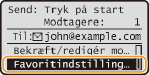 <Favoritindstillinger> <Rediger/slet> vælg indstillingen rediger indstillingen <Anvend> <Ja> . Du kan ikke ændre de modtagere, der er registreret i indstillingen, med denne procedure. Registrér en ny indstilling med de ønskede modtagere.Hvis du vil redigere en registreret indstilling, skal du trykke på