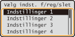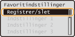 <Favoritindstillinger> <Rediger/slet> vælg indstillingen <Slet> <Ja> .De registrerede indstillinger gemmes, også når maskinen er slukket.