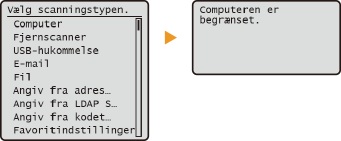Når afkrydsningsfeltet [Scan] markeres, deaktiveres scanning af dokumenter til USB-hukommelsesenheder, e-mails og filservere. Du kan også deaktivere scanning af dokumenter til computere via <Computer> og <Fjernscanner>. Du kan dog kun deaktivere scanning af dokumenter til computere for alle afdelings-id'er. (Blokering af job, når afdelings-id'et er ukendt).