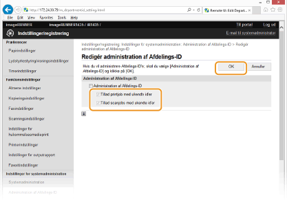 Marker afkrydsningsfeltet for at få vist pop op-skærmen [Kontroller afdelings-ID/PIN], hver gang du udskriver eller sender en fax fra en computer. [Godkend afdelings-ID/PIN på enhed]