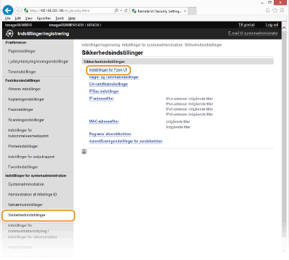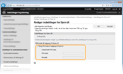 <Indstillinger for systemadministration> <Indstillinger for Fjern-UI> <Sik.indstilling. for adgang til Fjern-UI> <Til> Indtast PIN <Anvend> Indtast PIN (bekræft) <Anvend> .Hvis indstillingerne for Remote UI er initialiseretAdgangspinkoden for Remote UI initialiseres også. Nulstil pinkoden, når initialiseringen er færdig. Initialisering af menuer
