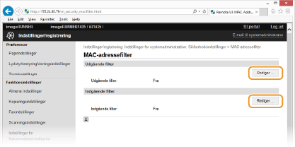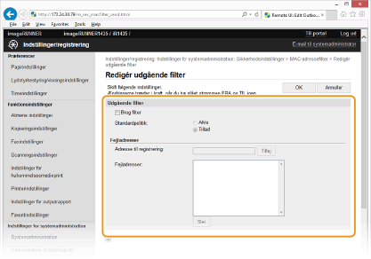 Kontroller tastefejl Hvis MAC-adresserne er indtastet forkert, kan du muligvis ikke få adgang til maskinen fra Brugerinterface til fjernbetjening. I dette tilfælde skal du angive <MAC-adressefilter> til <Fra>. MAC-adressefilter