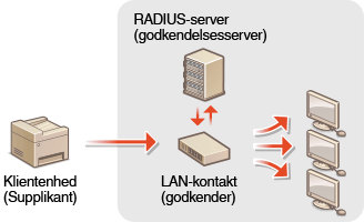 IEEE 802.1X er en standard og mekanisme til blokering af uautoriseret adgang til netværk ved samlet at administrere brugergodkendelsesoplysningerne. Hvis en enhed forsøger at oprette forbindelse til 802.1X-netværket, skal enheden igennem brugergodkendelse for at bevise, at forbindelsen oprettes af en autoriseret bruger. Godkendelsesoplysningerne sendes til og kontrolleres af en RADIUS-server, der tillader eller afviser kommunikation til netværket afhængigt af godkendelsesresultatet. Hvis godkendelsen mislykkes, blokerer en LAN-switch adgangen fra den eksterne side af netværket. Maskinen kan oprette forbindelse til et 802.1X-netværk som en klientenhed.
