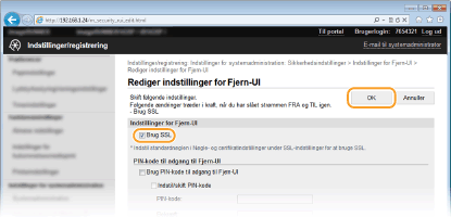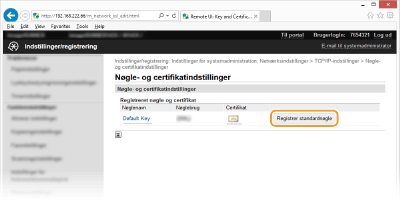 . Brug TLSStart af Remote UI med TLSHvis du forsøger at starte Remote UI, når TLS er aktiveret, kan der blive vist en sikkerhedsbesked om sikkerhedscertifikatet. I dette tilfælde skal du kontrollere, at den rigtige URL-adresse er angivet i adressefeltet og derefter fortsætte for at få vist skærmen Brugerinterface til fjernbetjening. Start af Brugerinterface til fjernbetjening