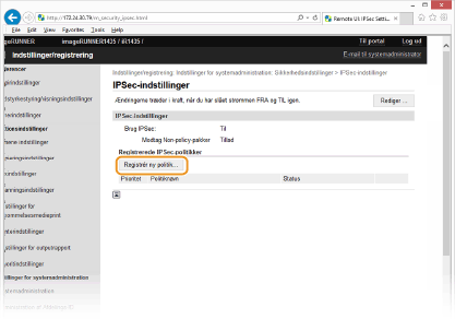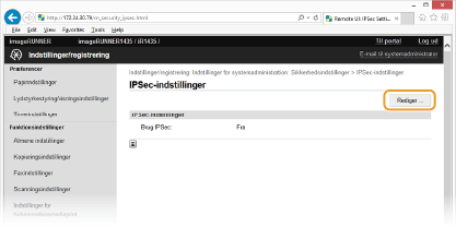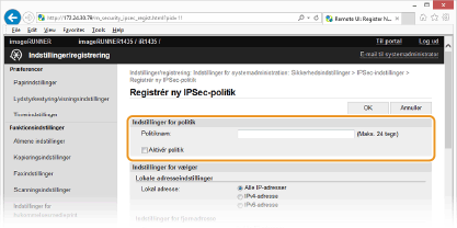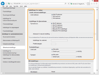 Vælg indstillingen for at angive en enkelt IPv4-adresse eller et udvalg af IPv4-adresser for at anvende IPSec. Angiv IPv4-adressen (eller området) i tekstfeltet [Adresser til manuel indstilling:].