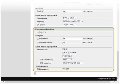 Hvis du vil aktivere ESP-godkendelsen, skal du vælge [SHA1] for hashalgoritmen. Vælg [Brug ikke], hvis du vil deaktivere ESP-godkendelsen.