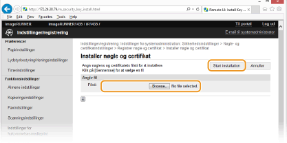 Nøglepar og digitale certifikater kan hentes fra en CA (certification authority) til brug på maskinen. Du kan gemme og derefter registrere disse filer ved hjælp af Brugerinterface til fjernbetjening. Sørg for, at nøgleparret og certifikatet over maskinens krav (