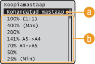 Koopia suurendamiseks või vähendamiseks saate kasutada eelmääratud paljundussuhteid (nt <A5->A4>) või määrata kohandatud paljundussuhte (sammuga 1%).
