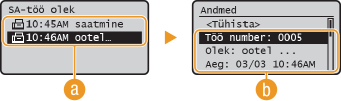 <Andmed>Kuvatakse loendist valitud dokumendi üksikasjalik teave. Kui määrasite mitu sihtkohta, kuvatakse määratud sihtkohtade arv. Mitme määratud sihtkoha üksikasjade vaatamiseks valige <Sihtkohtade arv> ja vajutage klahvi