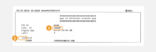 Kuvatakse sihtkoha nimi ja aadress või hosti nimi. Kui saadate dokumendi e-posti teel, siis märgitakse aruandes seadme ja meiliserveri (mitte seadme ja sihtaadressi) vahelise saatmise tulemus. Kolmekohalist tõrkekoodi ei prindita, isegi kui ülekanne ebaõnnestus. Tõrkekoodi kontrollimiseks printige välja sidehaldusaruanne (
