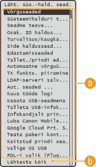 Seadistusmenüü loend). Teatavate seadete puhul on vaja seade lähtestamise lõpetamiseks taaskäivitada.