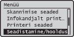 Kõik reguleerimise ja hooldamise sätted on esitatud lühikese kirjeldusega. Vaikeseaded on tähistatud ristiga (
