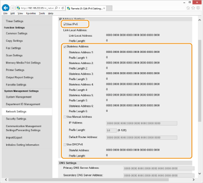 Seadme IPv6-aadresse saab konfigureerida Remote UI (Kaugkasutajaliides) kaudu. Enne IPv6-aadresside määramist kontrollige IPv4-aadressi seadeid (IPv4-seadete kuvamine). Võtke arvesse, et IPv6-keskkonnas pole skanneri draiverit kasutav skannimisfunktsioon saadaval. IPv6-aadresside kasutamiseks peavad teil olema määratud õiged IPv4-seaded. Seade saab kasutada kuni üheksat järgmist IPv6-aadressi.