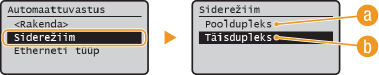 , valige <Pooldupleks> või <Täisdupleks> .![]() <Pooldupleks>Vaheldumisi saadab ja võtab vastu sideandmeid. Valige, millal on seade võrguseadmega ühendatud pooldupleksi abil.