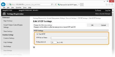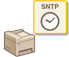Simple Network Time Protocol (SNTP) (lihtne võrguaja protokoll) võimaldab kohandada süsteemikella võrgus oleva ajaserveri abil. Protokolli kasutatakse tavaliselt seadme ja serveri sünkroonimiseks (nt kui seade vajab juurdepääsu LDAP-serverisse lubatud turbeautentimisega). Aeg reguleeritakse koordineeritud maailmaaja (UTC) põhjal, seega tuleb teil ajavöönd määrata enne SNTP (Kuupäeva/kellaaja seaded) konfigureerimist. SNTP seaded saab määrata Remote UI (Kaugkasutajaliides) abil.