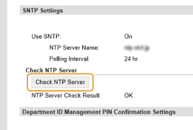 [Network Settings] [TCP/IP Settings] ja klõpsake [Check NTP Server] jaotises [SNTP Settings]. Õige võrguühenduse korral kuvatakse allnäidatud tulemus. Võtke arvesse, et selle toiminguga ei reguleerita süsteemikella.![]() |