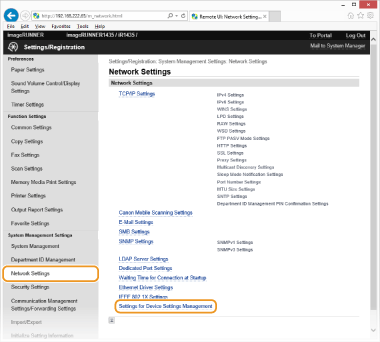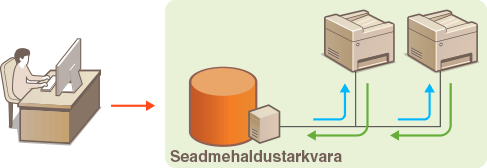 Võrguseadmete kohta erineva teabe kogumist ja juhtimist saate lihtsustada seadmehaldustarkvara juurutamisega (nt iW Management Console*). Teavet (nt seadme seaded, telefoniraamatud, ja tõrkelogid) tuuakse ja jagatakse serveriarvuti kaudu. Kui seade on ühendatud sellisesse võrku, otsib seadmehaldustarkvara seadme võrku, kasutades seadmest teabe kogumiseks protokolle (Service Location Protocol (SLP)). Selles jaotises kirjeldatakse SLP seadete määramise toiminguid ning seadme ja konsooli iW Management Console lisandmoodulite vahelist sideühendust. Need seaded saab määrata Remote UI (Kaugkasutajaliides) abil.