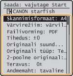 Kui valite seade <Failivorming> abil JPEG, saab dokumendi asetamisel skannimisklaasile skannida ainult ühe lehe. Mitme dokumendi korraga skannimiseks asetage need sööturisse. Need dokumendid skannitakse ja salvestatakse eraldi failidena. Kui valisite PDF või TIFF, siis saab mitu dokumenti skannida ja salvestada ühe failikomplektina, sõltumata sellest, kas dokumendid on asetatud skannimisklaasile või sööturisse.