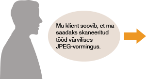 Määrake oma kliendi e-posti aadressi puhul skannimisseadete all seaded <Värviline> ja <JPEG> ning salvestage aadress ja seaded kombinatsioonina <Lemmikseaded> all. Sageli kasutatavate skannimisseadete salvestamine (e-post/failiserver)