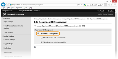 Märkige ruut [Use Department ID Management] (Kasuta osakonna ID haldust) ja klõpsake sellest paremal asuvat nuppu [Settings] (Seaded).