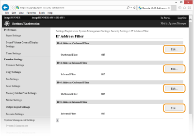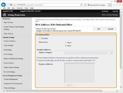 Veenduge, et pole sisestusvigu. Kui IP-aadressid sisestatakse valesti, ei pruugi te Remote UI (Kaugkasutajaliides) kaudu seadmega juurdepääsu saada. Sel juhul peate seadma valiku <IPv4-aadressi filter> või <IPv6-aadressi filter> väärtuseks <Off>. IPv4-aadressi filter IPv6-aadressi filter