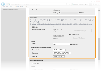 Määrake seadete [Valid for:] ja [Authentication:]/[Encryption:]/[DH Group:] väärtused.