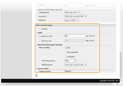 ESP autentimise lubamiseks valige räsialgoritmiks [SHA1]. Kui soovite ESP autentimise keelata, valige väärtus [Do Not Use].