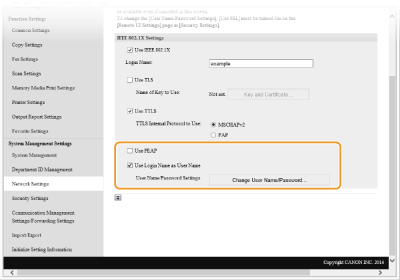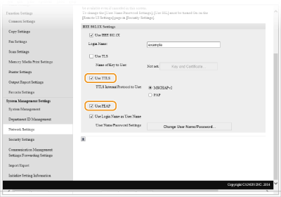 Nõutavad seaded on peaaegu samad kui TTLS-protokollil. Sisemise protokollina kasutatakse MSCHAPv2-protokolli. Lubage enne selle autentimisviisi konfigureerimist rakenduse Remote UI (Kaugkasutajaliides) jaoks TLS (