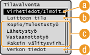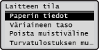 Näyttää laitteen tilan, esimerkiksi jäljellä olevan paperin tai väriaineen määrän.
