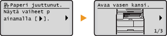 Joissakin tapauksissa, kun tapahtuu virhe, näytetään ohjeet virheen korjaamiseksi. Ratkaise ongelma noudattamalla näyttöön tulevia ohjeita. Alla näytetään esimerkkinä näyttö, joka tulee esiin, kun tapahtuu paperitukos (