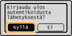 vaihtaaksesi toiseen toimintoon nykyisin käyttämästäsi toiminnosta, avautuu uloskirjautumisen vahvistusikkuna. Kirjautuaksesi ulos Valtuuteusta lähetyksestä (faksi tai skannaustoiminto), käytä / -painiketta valitaksesi <Kyllä> , ja paina .![]() |