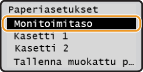 Kun oletuspaperiasetus on tallennettu, paperiasetusnäyttöä ei näytetä, kun paperia lisätään, ja samaa asetusta käytetään aina. Jos lisäät erilaista paperikokoa tai -tyyppiä vaihtamatta paperiasetuksia, laite ei ehkä tulosta oikein. Voit välttää tämän ongelman poistamalla oletusasetuksen käytöstä valitsemalla <Ei> vaiheessa 3 ja lisäämällä sitten paperin.