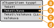 Voit valita kopion kuvanlaadun asiakirjatyypin mukaan, esimerkiksi vain tekstiä sisältävät asiakirjat, kuvia ja kaavioita sisältävät asiakirjat tai lehtikuvat.