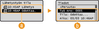 .![]() <Lähetystyön tila>/<Vastaanottotyön tila>Näyttää luettelon kaikista asiakirjoista, joita lähetetään tai vastaanotetaan tai jotka odottavat käsittelyä.