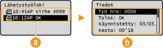 .![]() <Lähetystyöloki>/<Vastaanottotyöloki>Näyttää luettelon lähetetyistä ja vastaanotetuista asiakirjoista. <OK> näytetään, kun asiakirjan lähetys tai vastaanotto onnistui, ja <Virhe>, kun asiakirjan lähetys tai vastaanotto epäonnistui, koska se peruutettiin tai tapahtui virhe.