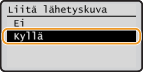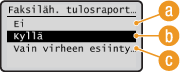 Kun valitset <Kyllä> tai <Vain virheen esiintyessä>, osa faksatusta asiakirjasta voidaan sisällyttää raporttiin. Aseta <Liitä lähetyskuva> asentoon <Kyllä>, ja paina  .