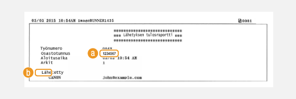 Vastaanottajan nimi ja osoite tai isäntänimi näytetään. Jos lähetit asiakirjan sähköpostilla, raportti ilmoittaa lähetystuloksen laitteen ja postipalvelimen välillä, mutta ei laitteen ja vastaanottajan osoitteen välillä. Kolminumeroista virhekoodia ei tulosteta vaikka lähetys epäonnistuisi. Tarkista virhekoodi tulostamalla liikennöinnin hallintaraportti (