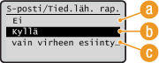 Voit tulostaa raportin tarkistaaksesi s-posti tai tiedostopalvelinlähetyksen tuloksen. Raportti voidaan tulostaa joko joka kerran, kun lähetys on valmis, tai vain jos tapahtuu lähetysvirhe.
