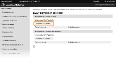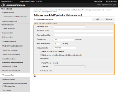 Jos verkossa on käytössä LDAP-palvelin, voit etsiä palvelimelta faksinumeroita ja sähköpostiosoitteita sekä määrittää ne sitten vastaanottajiksi tai tallentaa ne osoitekirjaan. Voit tallentaa enintään viisi LDAP-palvelinta laitteeseen. Tallenna LDAP-palvelimet Etäkäyttöliittymän avulla.