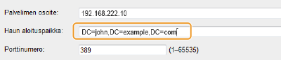 Kun määrität solmun, syötä "DC=", jota seuraa isäntänimi (pisteillä eroteltu merkkijono Active Directory -toimialuenimessä), ja erota syötetyt tiedot pilkuilla. Jos toimialuenimi on esimerkiksi "john.esimerkki.com", syötä "DC=john,DC=esimerkki,DC=com".