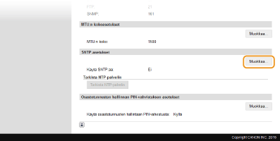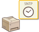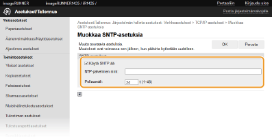 SNTP (Simple Network Time Protocol) -protokollan avulla voit säätää järjestelmän kelloa käyttämällä verkossa olevaa aikapalvelinta. Tätä protokollaa käytetään tyypillisesti laitteen ja palvelimen synkronointiin, esimerkiksi kun laitteen tarvitsee käyttää LDAP-palvelinta, jossa on käytössä todennus. Aika säädetään UTC (Coordinated Universal Time) -ajan perusteella, joten määritä aikavyöhykkeen asetus ennen SNTP:n määrittämistä (Päivämäärä/Aika-asetukset). SNTP-asetukset voidaan määrittää Etäkäyttöliittymän avulla.