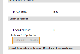 [Verkkoasetukset] [TCP/IP-asetukset] ja valitse [Tarkista NTP-palvelin] kohdassa [SNTP-asetukset]. Jos yhteys on muodostettu oikein, tulos näkyy alla näytetyn kaltaisena. Huomaa, että tämä toiminto ei säädä järjestelmän kelloa.![]() |
