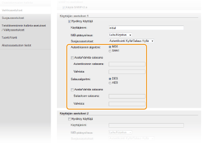 Määritä tai vaihda salasana valitsemalla valintaruutu ja syöttämällä 6–16 aakkosnumeerista merkkiä salasanaksi [Autentikoinnin salasana:]/[Salauksen salasana:] -kenttään. Vahvista syöttämällä sama salasana [Vahvista:]-kenttään. Todennus- ja salausalgoritmien salasanat voi asettaa erikseen. |
