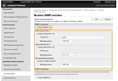 Jos et käytä SNMPv1:täJos molemmat SNMP-versiot poistetaan käytöstä, jotkin laitteen toiminnot eivät ole käytettävissä, kuten laitteen tietojen hakeminen tulostinajurin kautta.