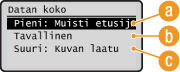 Voit määrittää tiedoston pakkaussuhteen jota käytetään kun asiakirjoja skannataan määrittämääsi tiedostomuotoon (Tiedostomuodon valitseminen). <Pieni: Muisti etusijalla> -asetuksella pakkaussuhde on normaalia suurempi, jolloin luodaan pienempiä tiedostoja, joilla on heikompi kuvanlaatu. Toisaalta <Suuri: Kuvan laatu etusijalla> -asetuksella pakkaussuhde on normaalia pienempi, jolloin luodaan suurempia tiedostoja, joilla on parempi kuvanlaatu.