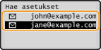 Jos katkaiset laitteesta virran tai asetat <Rajoita uusia vastaanottajia> asetukseksi <Kyllä>, aiemmat vastaanottajat poistetaan ja ja ehkäistään niiden hakeminen. Käytettävissä olevien vastaanottajien rajoittaminen